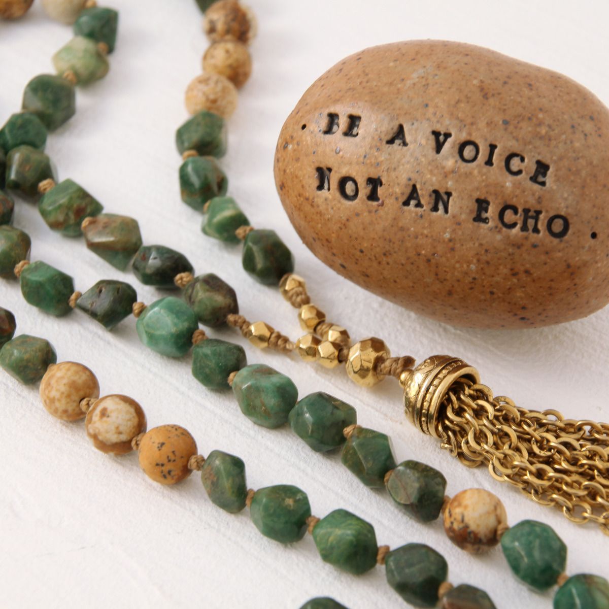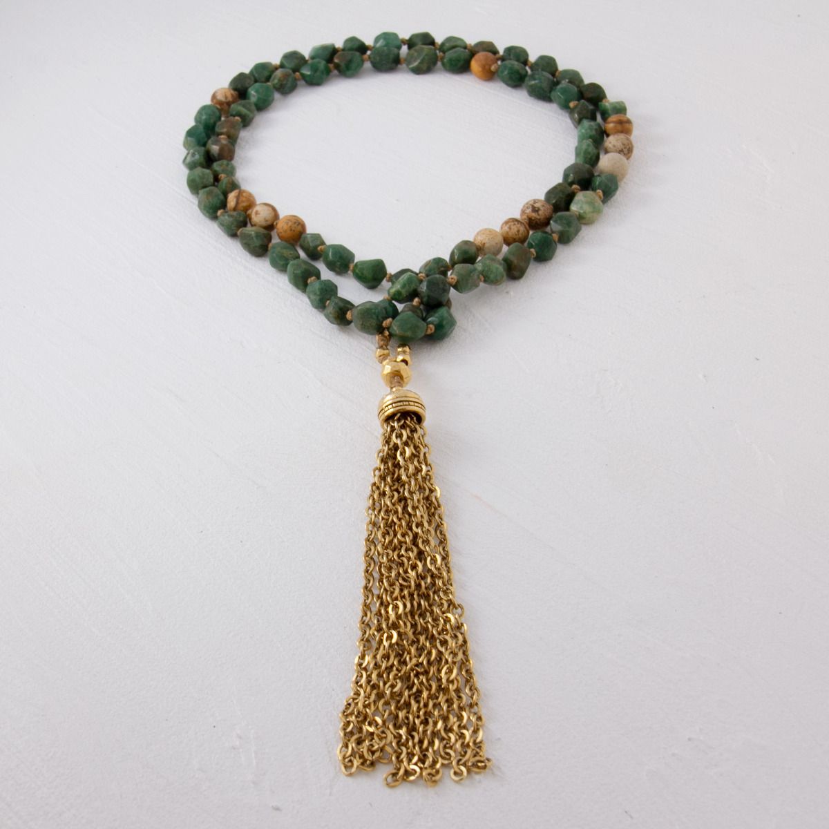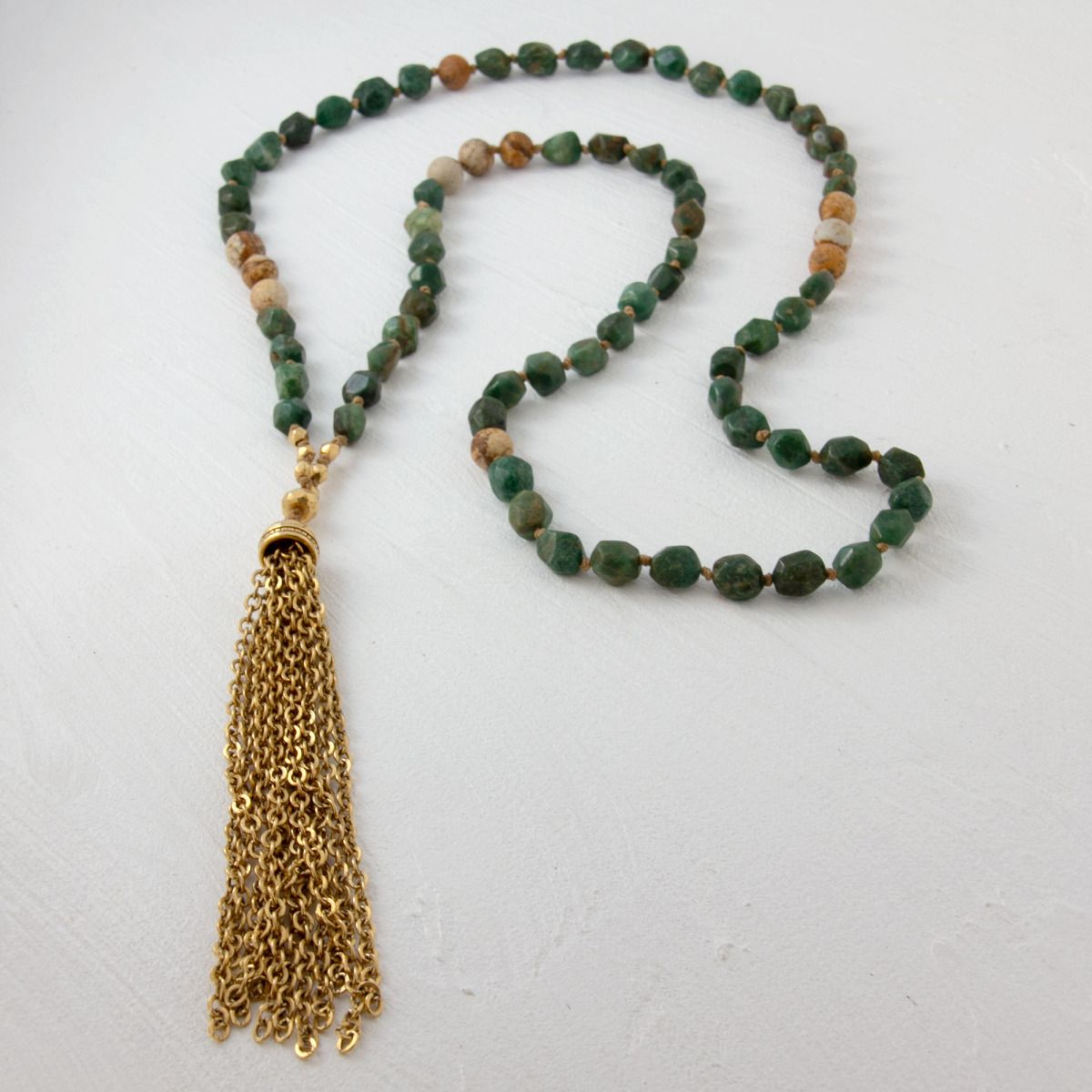 Color! The green of this African jade was to DIE for. I had to have it but had no idea what it was going to become. Matte picture jasper brought out the honeyed amber tones in the jade, but it still needed some shine, and some edge. Silk tassels may be beloved by many, but for those of us apt to "accidentally" dunk our long necklaces in our coffee, metal is better.