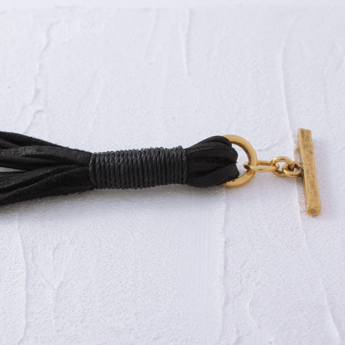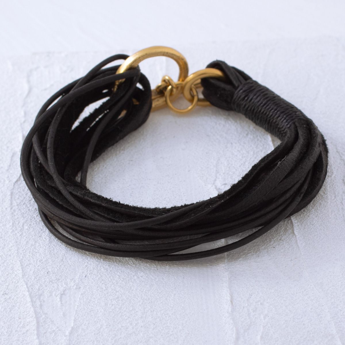 It's the leather piece you'll reach for every day - loops of black leather lacing and cord encircle a distressed gold ring and toggle. Designed to showcase the texture and color variations of leather and the reverse suede.