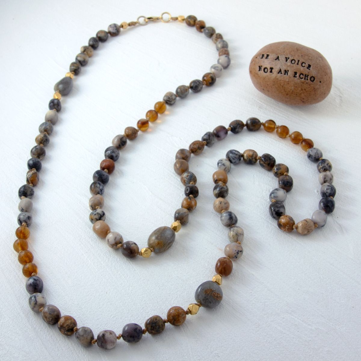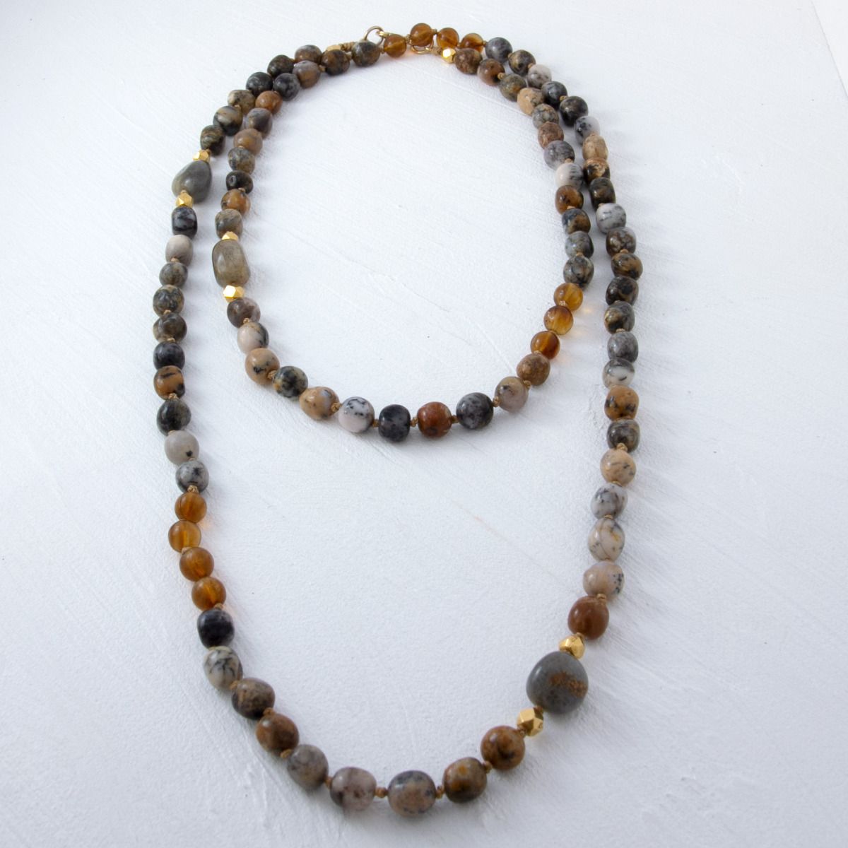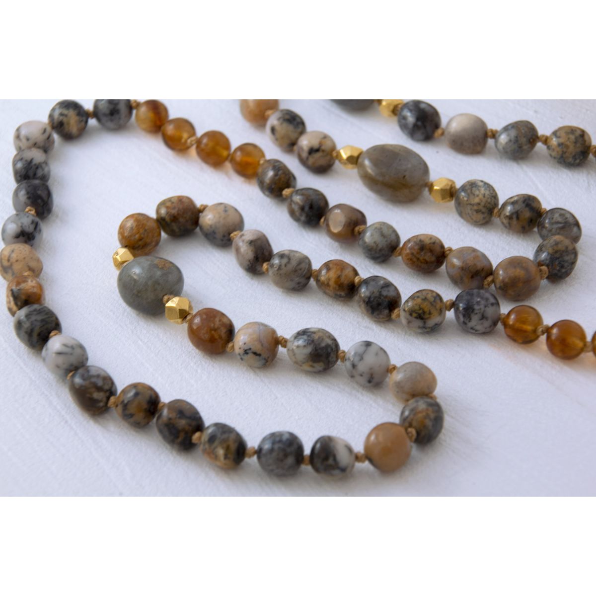 Another day of play. Often I pull out my many beads and spread them on the floor like Legos, looking to be inspired to make new combinations. Eureka! I wanted to find something that complimented the labradorite pebbles and played off the flashes of copper. Moss opal came to the party, brought along some yellow fluorite that I was never sure what to do with. Seems it was waiting to partner up with moss opal. It's weirdly satisfying when you create something with elements that seems so well suited to each other.