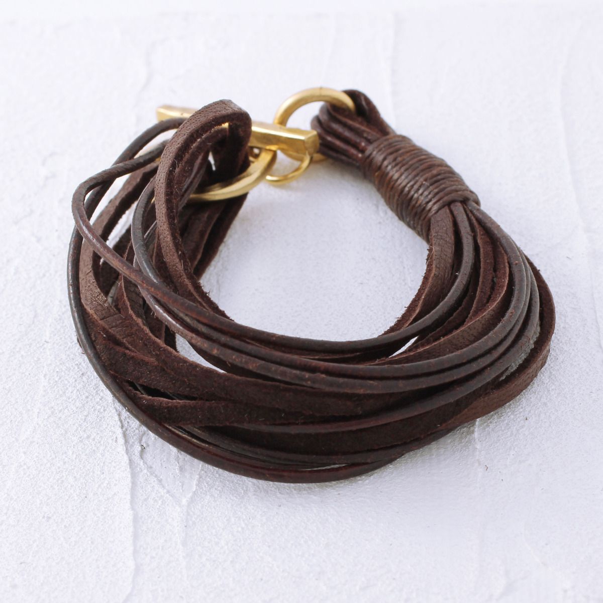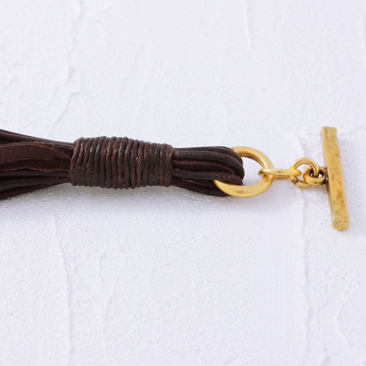 It's the leather piece you'll reach for every day - loops of brown leather lacing and cord encircle a distressed gold ring and toggle. Designed to showcase the texture and color variations of leather and the reverse suede.