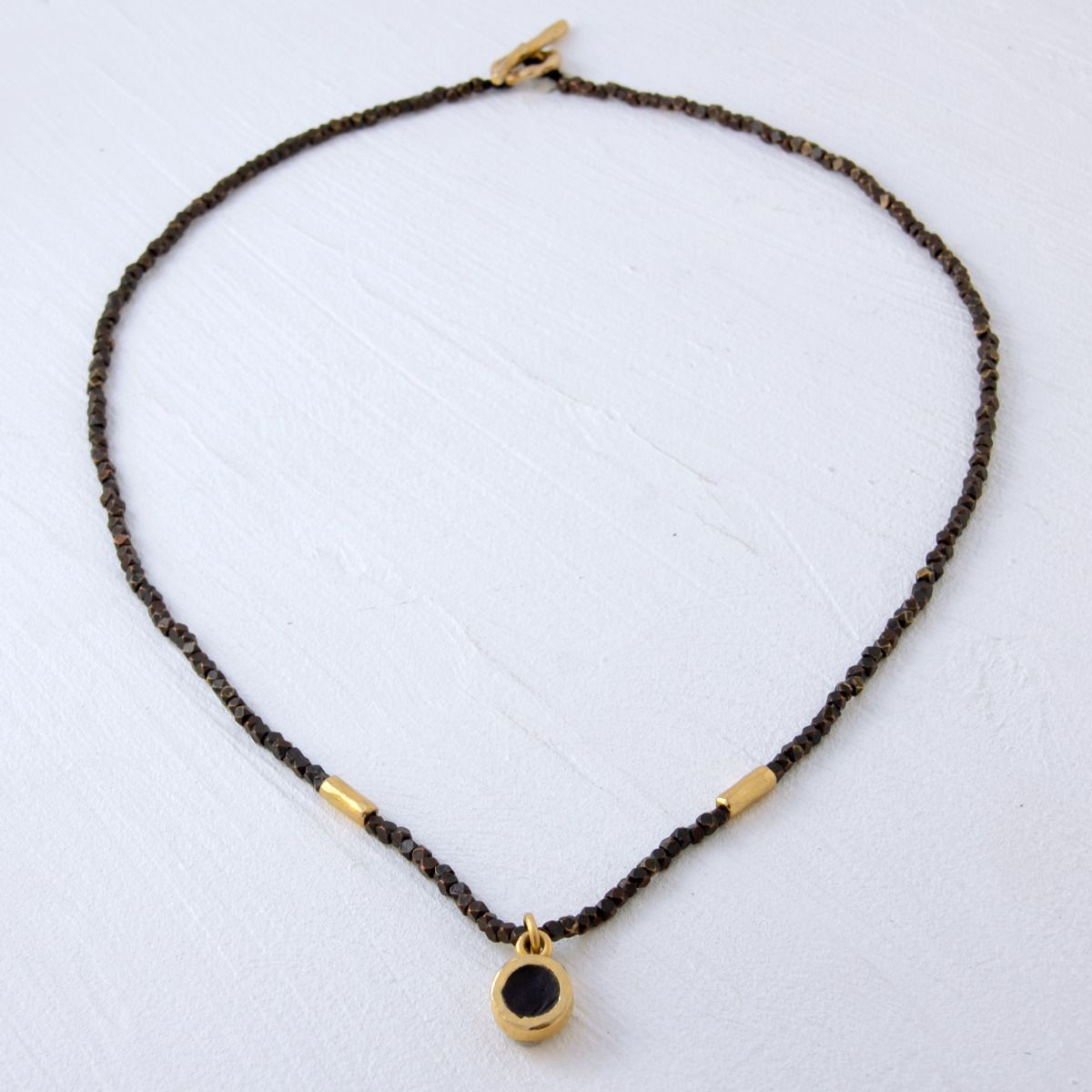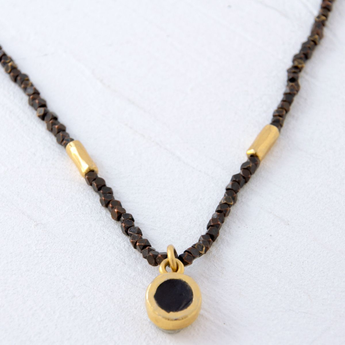 A tiny carbon black + gold circle charm slides along a strand of miniature balckened brass metal beads.