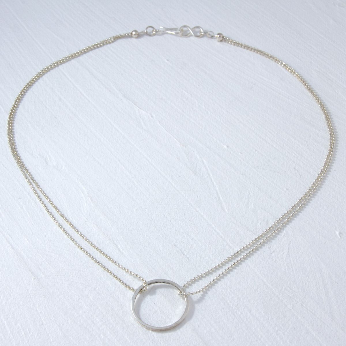 Suspended between loops of faceted ball chain, this delicate silver ring has a simple elegance that appeals to minimalists.