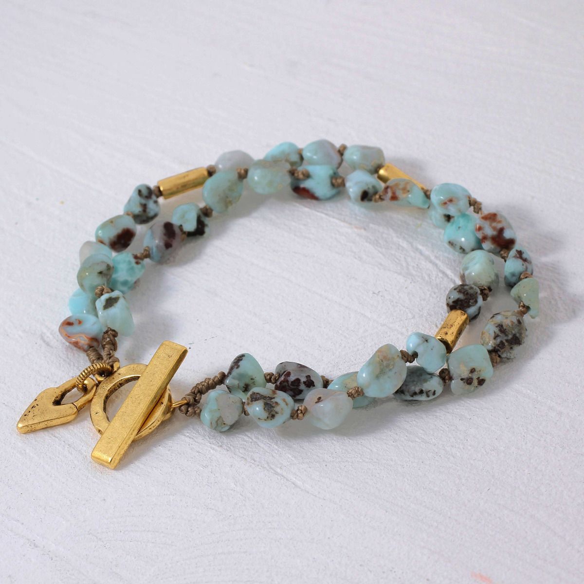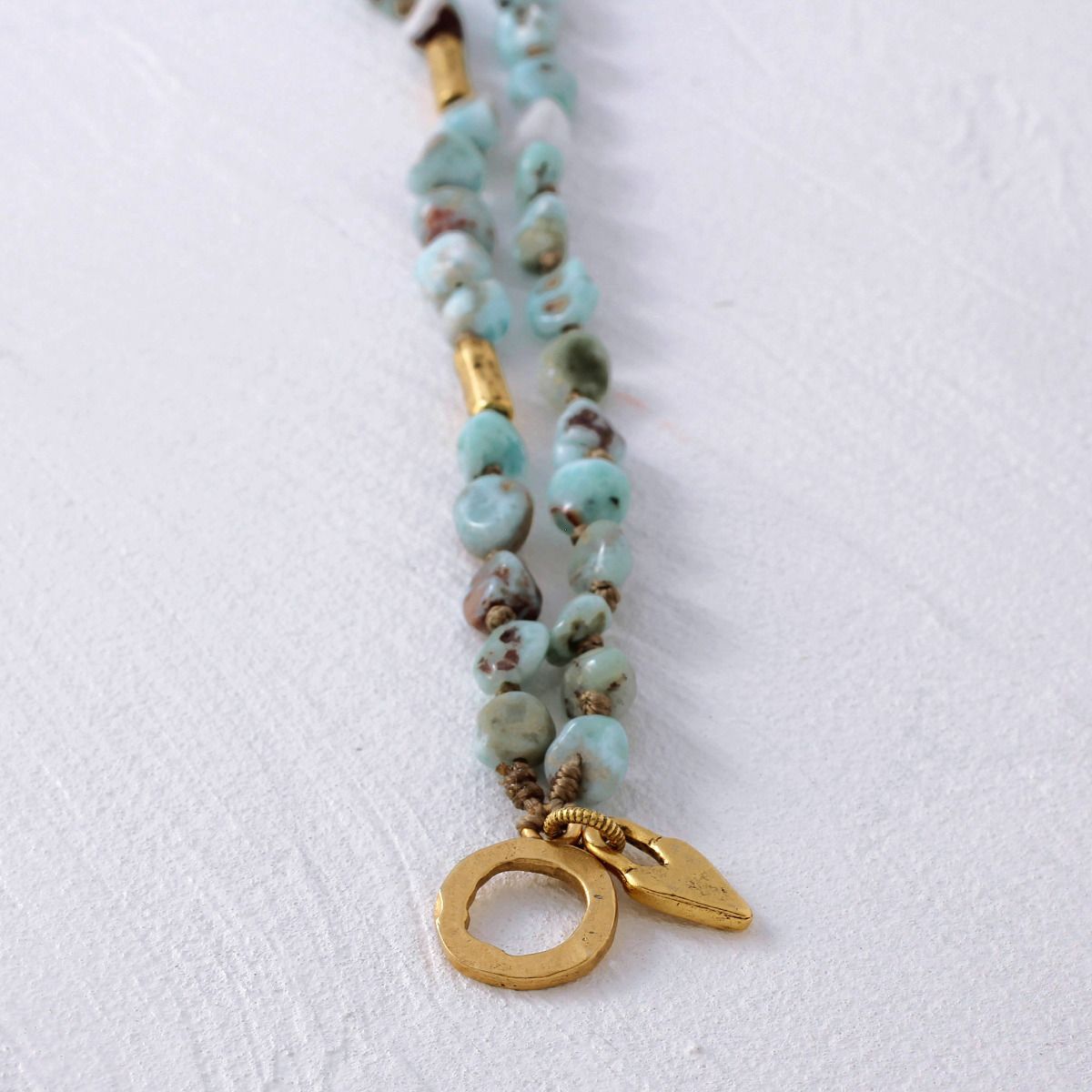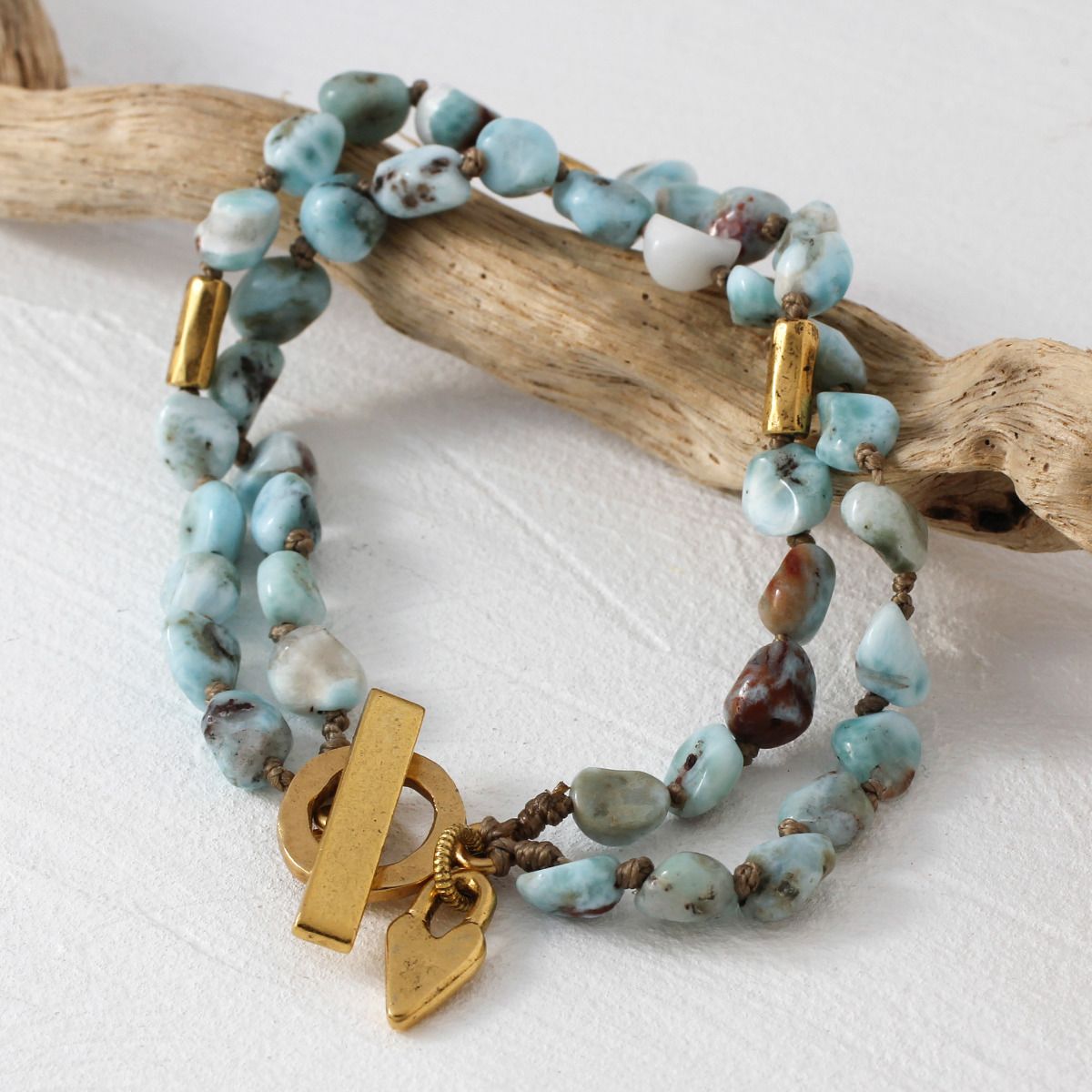 More precious than turquoise, 2 strands of larimer pebbles are hand knotted with 24k gold plated heart charm, beads, and toggle closure.