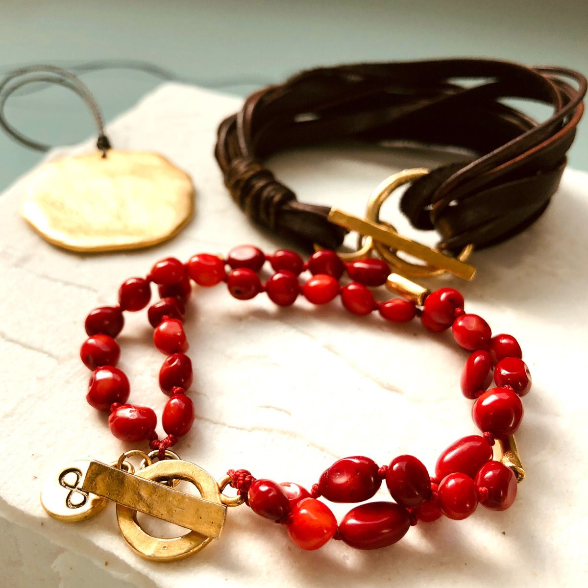 Make it a double (wrap). One strand of coral, one of coral and gold, accented with a rustic toggle closure and eternity charm.