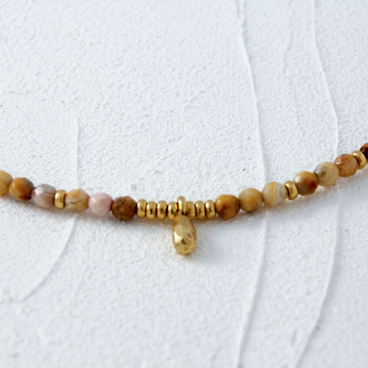 Sweet, petite and delicate in scale, the warm, golden variations of the faceted agate are a mix of every lovely skin tone. Accented with gold spacers and a teensy gold drop, this necklace is just the right amount of neutral.