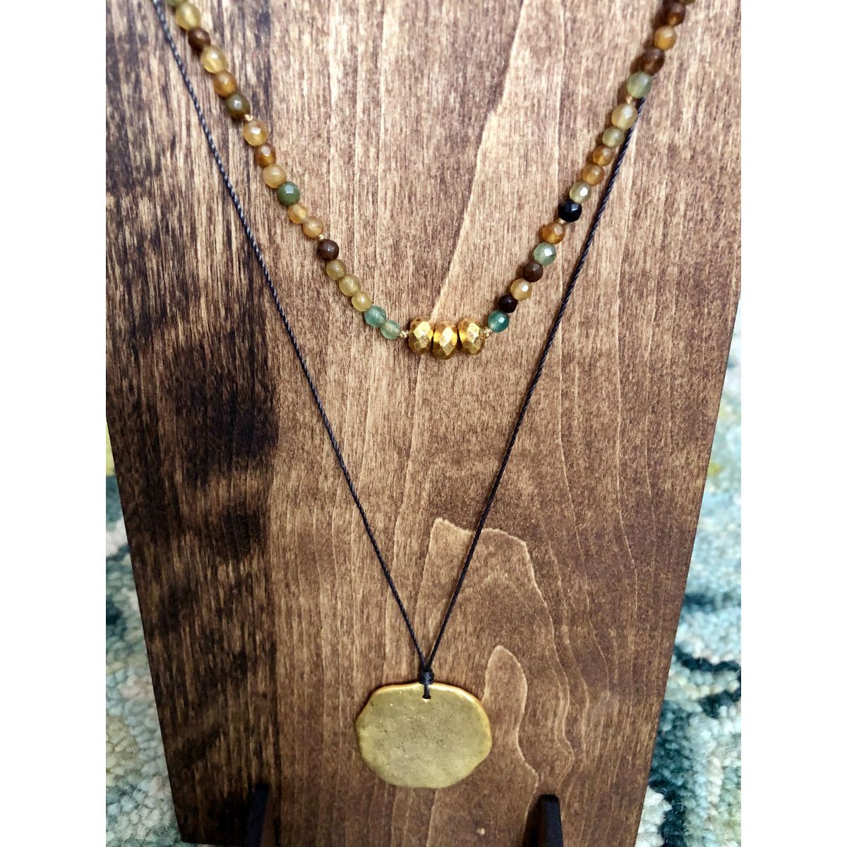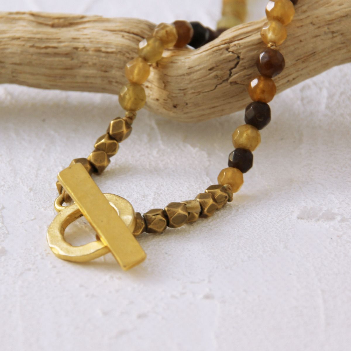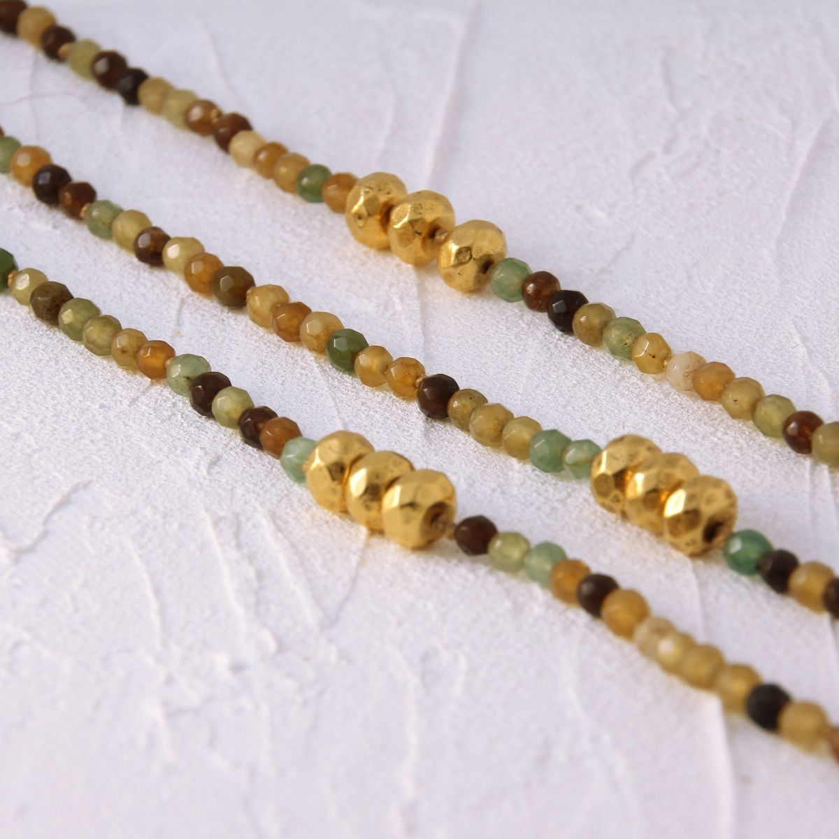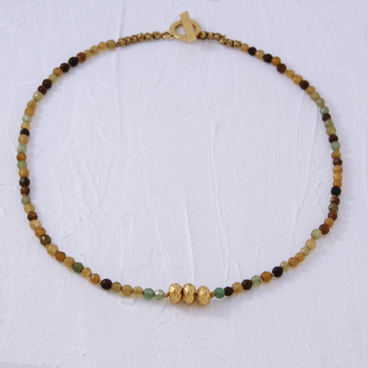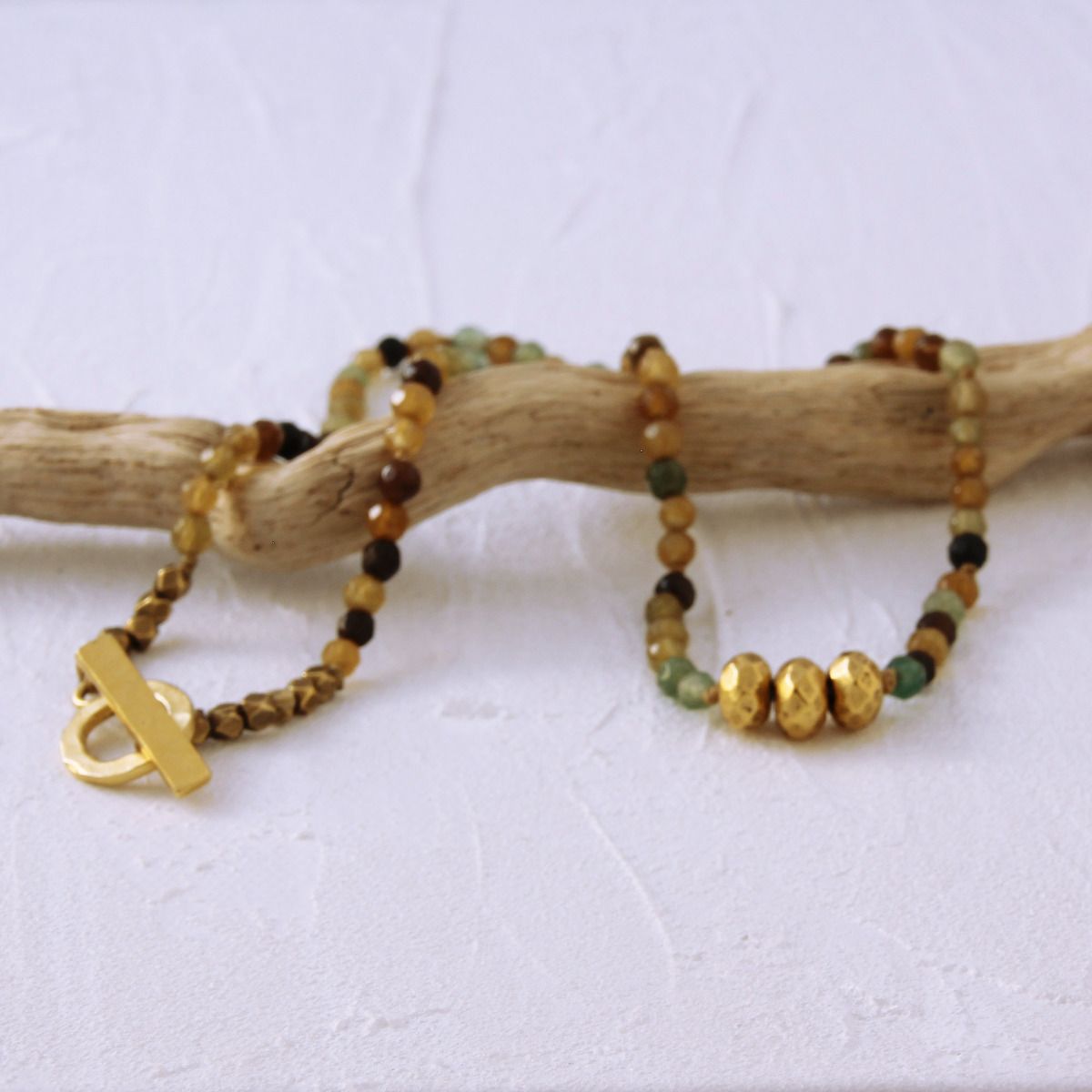 Three faceted gold beads take center stage, complimented by all the colors of the forest - warm browns, dappled tans, clear greens, hand knotted for durability, and finished with an easy to use gold toggle and ring closure. Wear as is or layer in longer necklaces to bring out more of the warm, woodsy hues.
