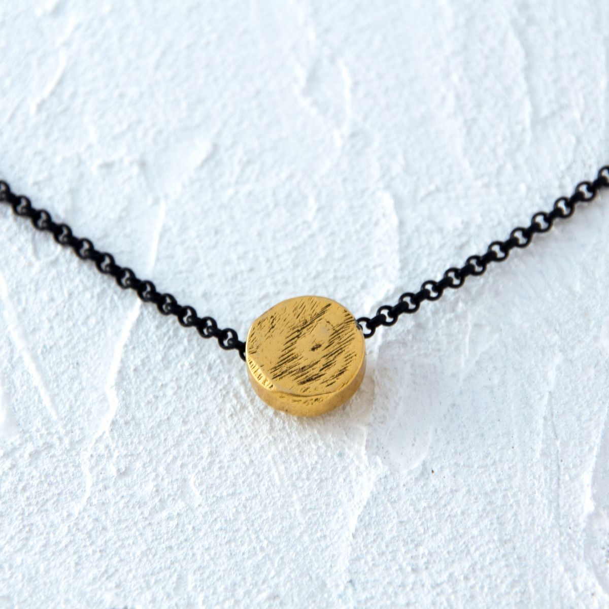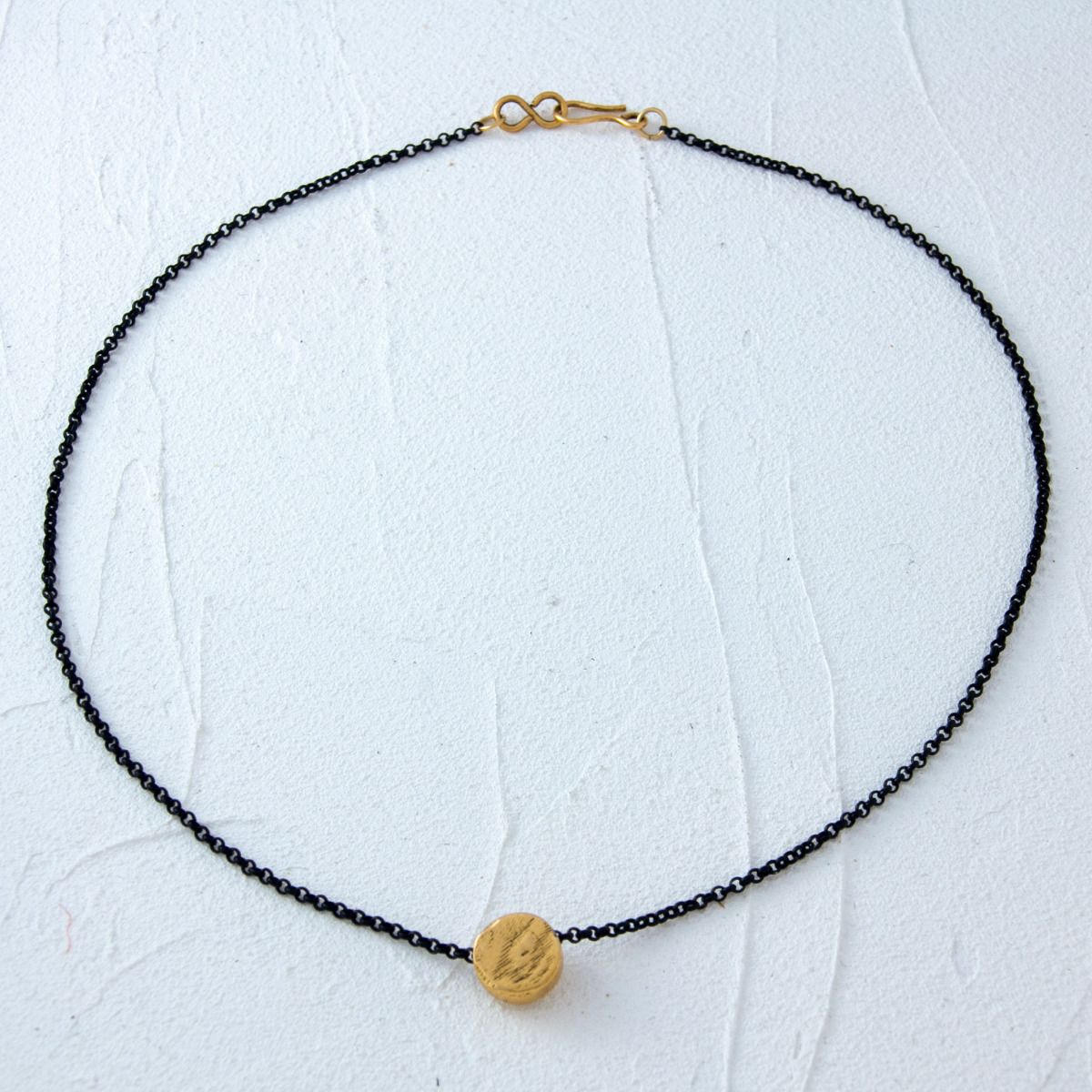 Simple, rustic, striking. A hammered, gold disc is threaded on matte black chain accented with a simple hook and eye closure in gold.