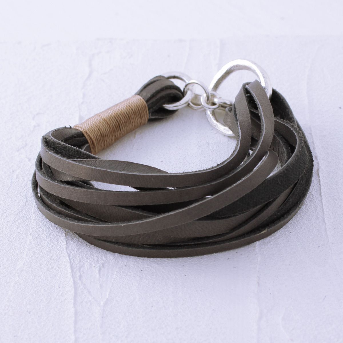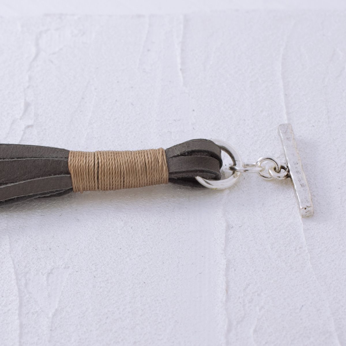 It's the leather piece you'll reach for every day - loops of gray leather lacing in different widths encircle a distressed silver ring and toggle. Designed to showcase the texture and color variations of leather and the reverse suede.