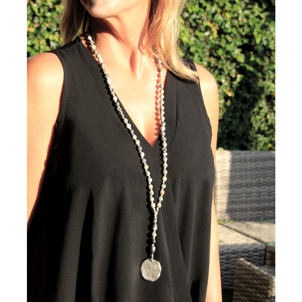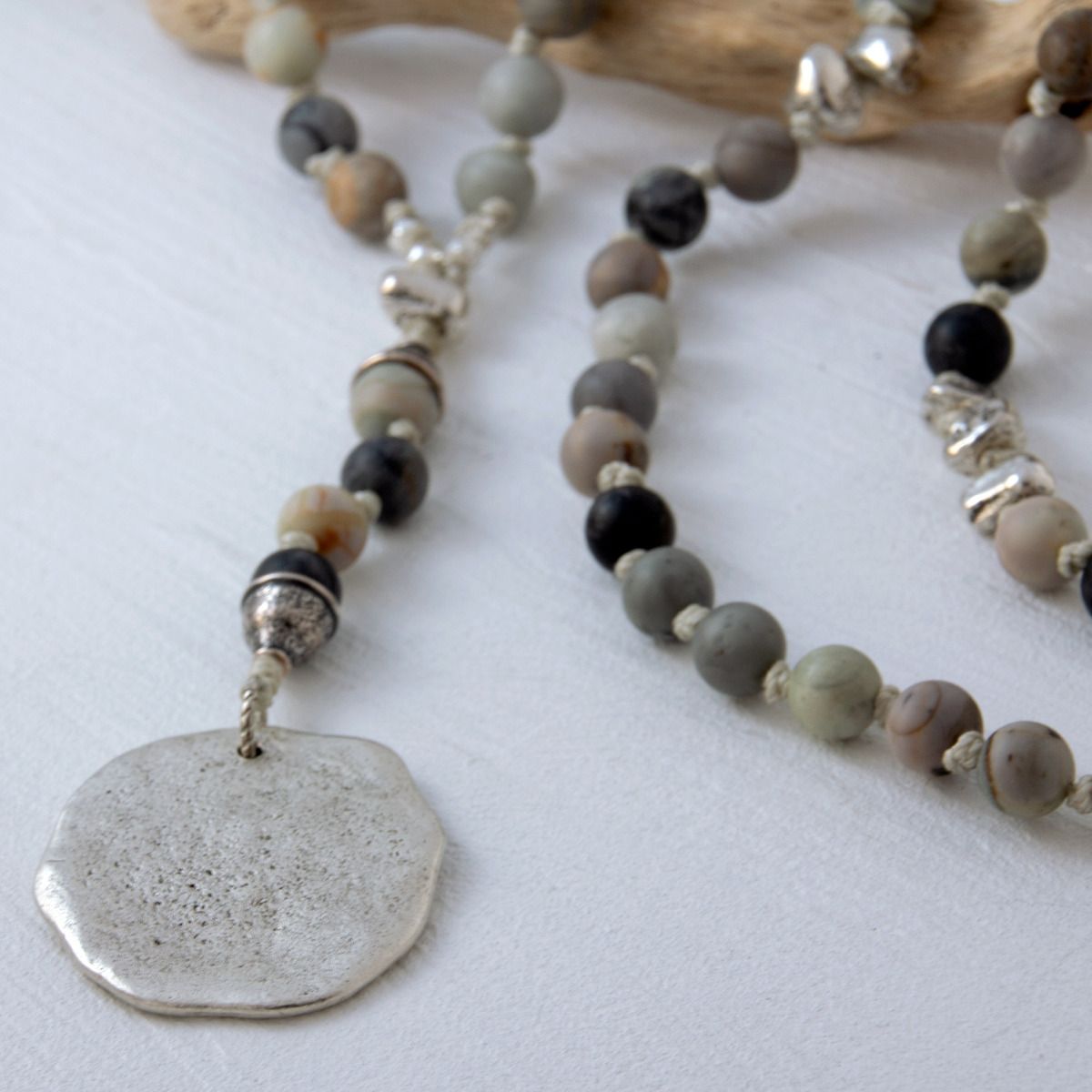 Matte and shine, smooth and weathered, shades of silvery gray come together in this versatile style hero necklace.