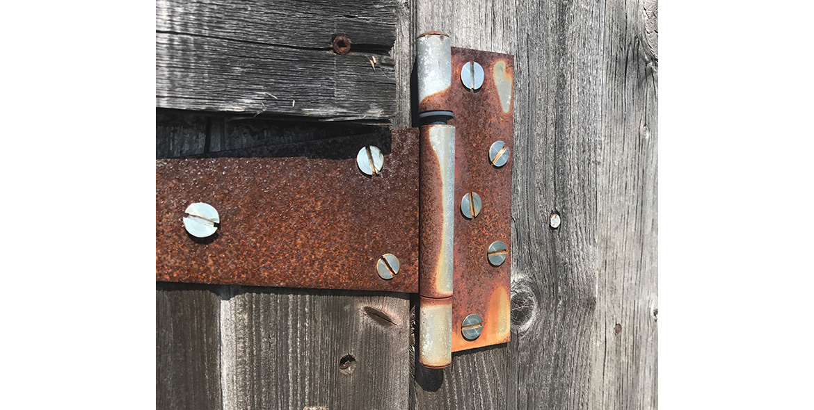 Weathered hinges and wood, photographed somewhere on the coast of Maine