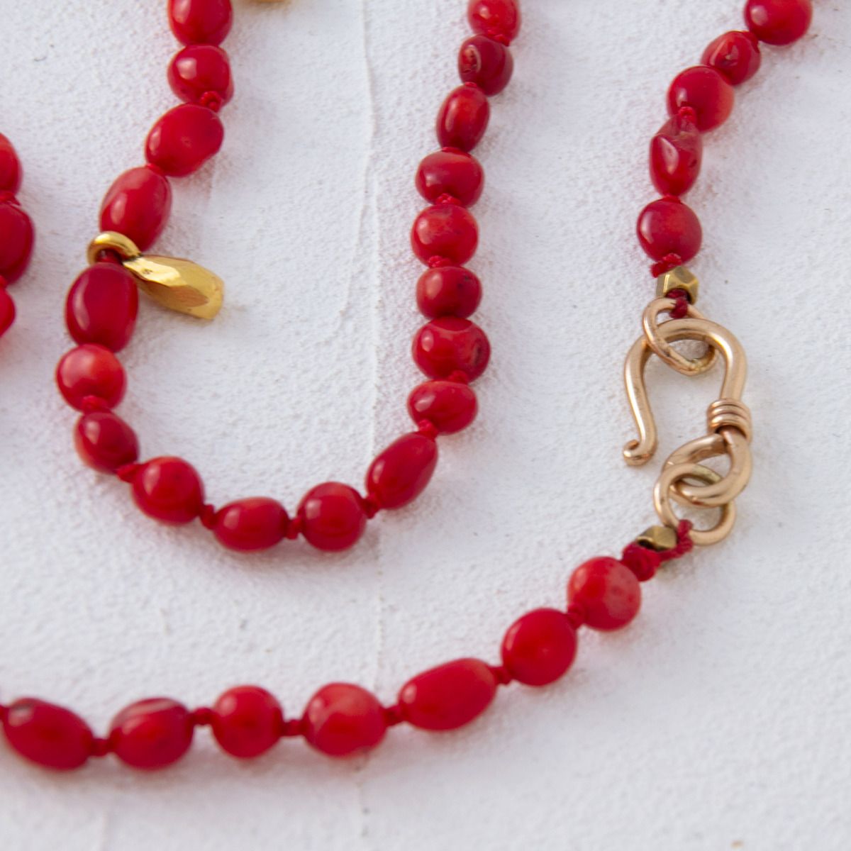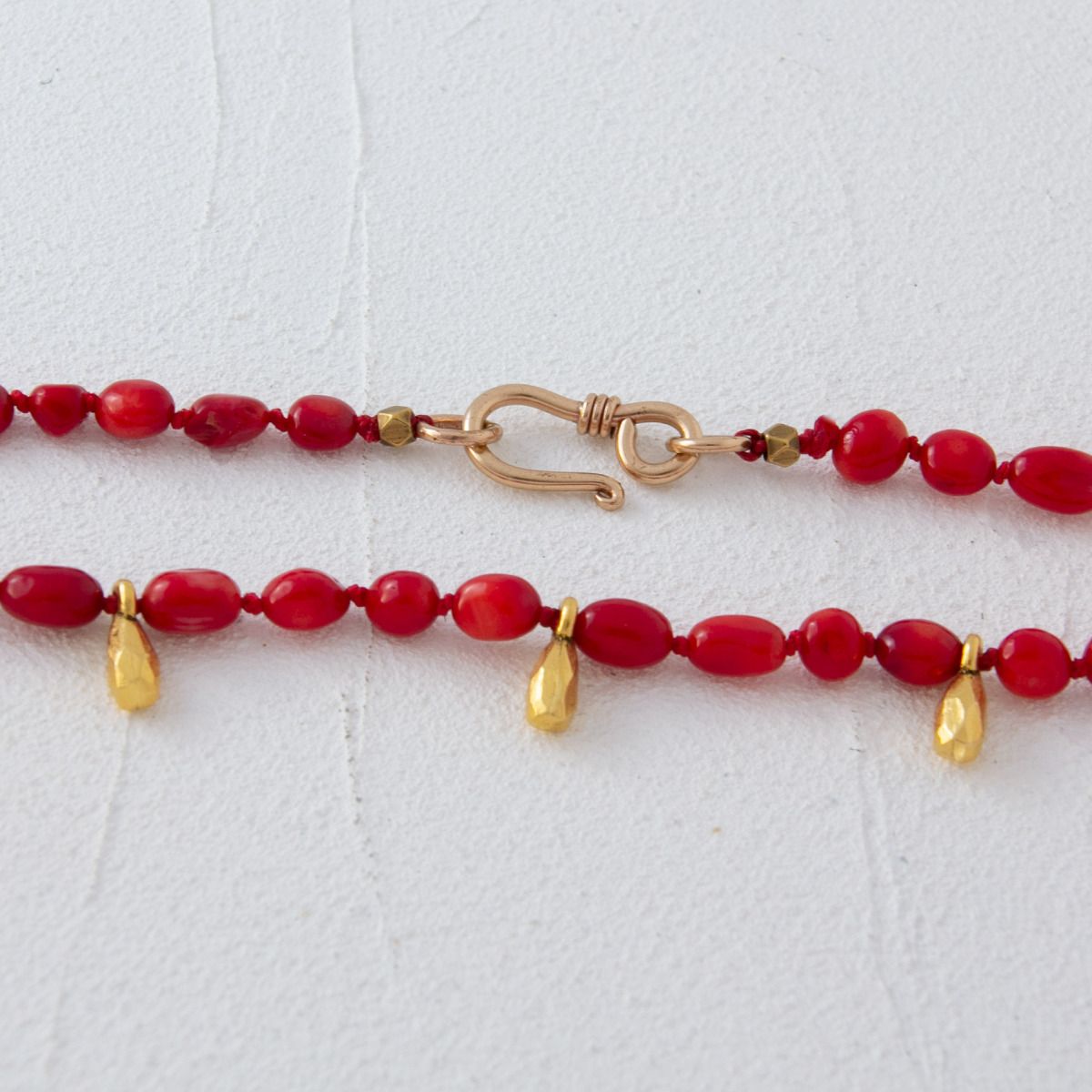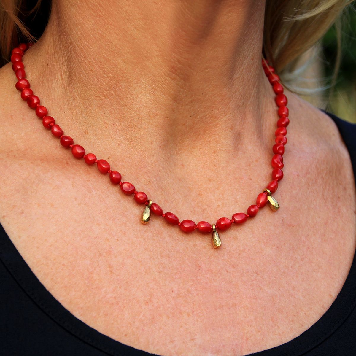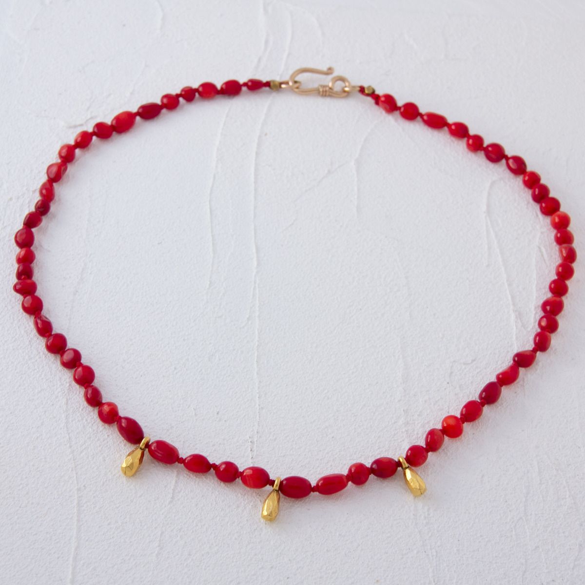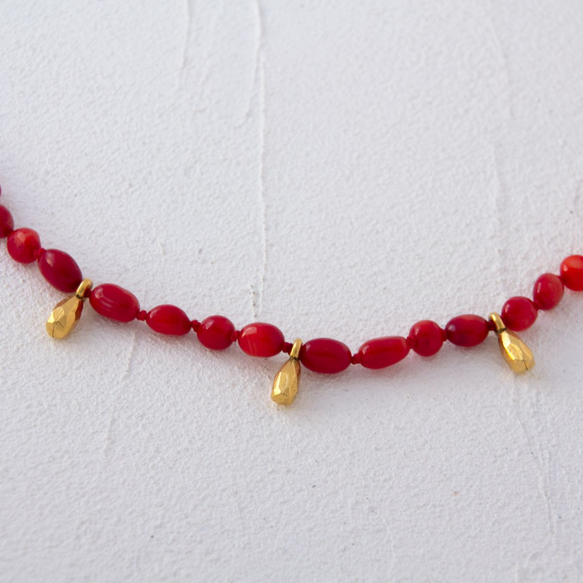 One, two, three - 3 tiny faceted gold charms are spaced between red coral pebbles that glow with rich, vibrant color.